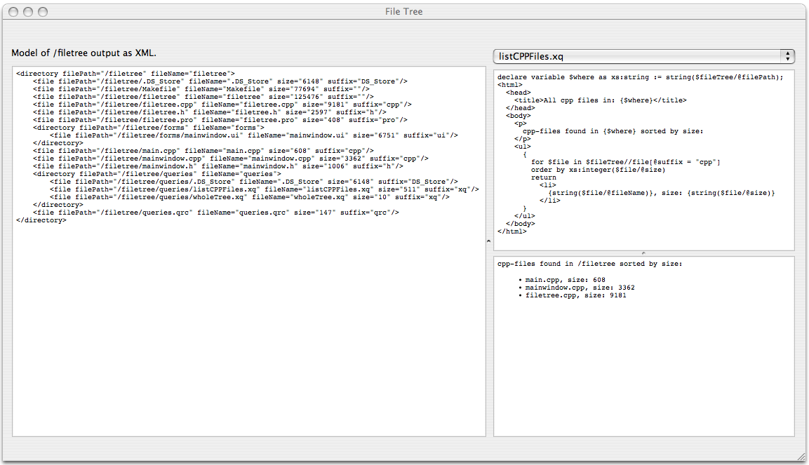 loadDirectory() demonstrates a standard code pattern for using Qt XML Patterns programatically. First it gets the node model index for the root of the selected directory. Then it creates an instance of QXmlQuery and calls QXmlQuery::bindVariable() to bind the node index to the XQuery variable $fileTree. It then calls QXmlQuery::setQuery() to load the XQuery text.